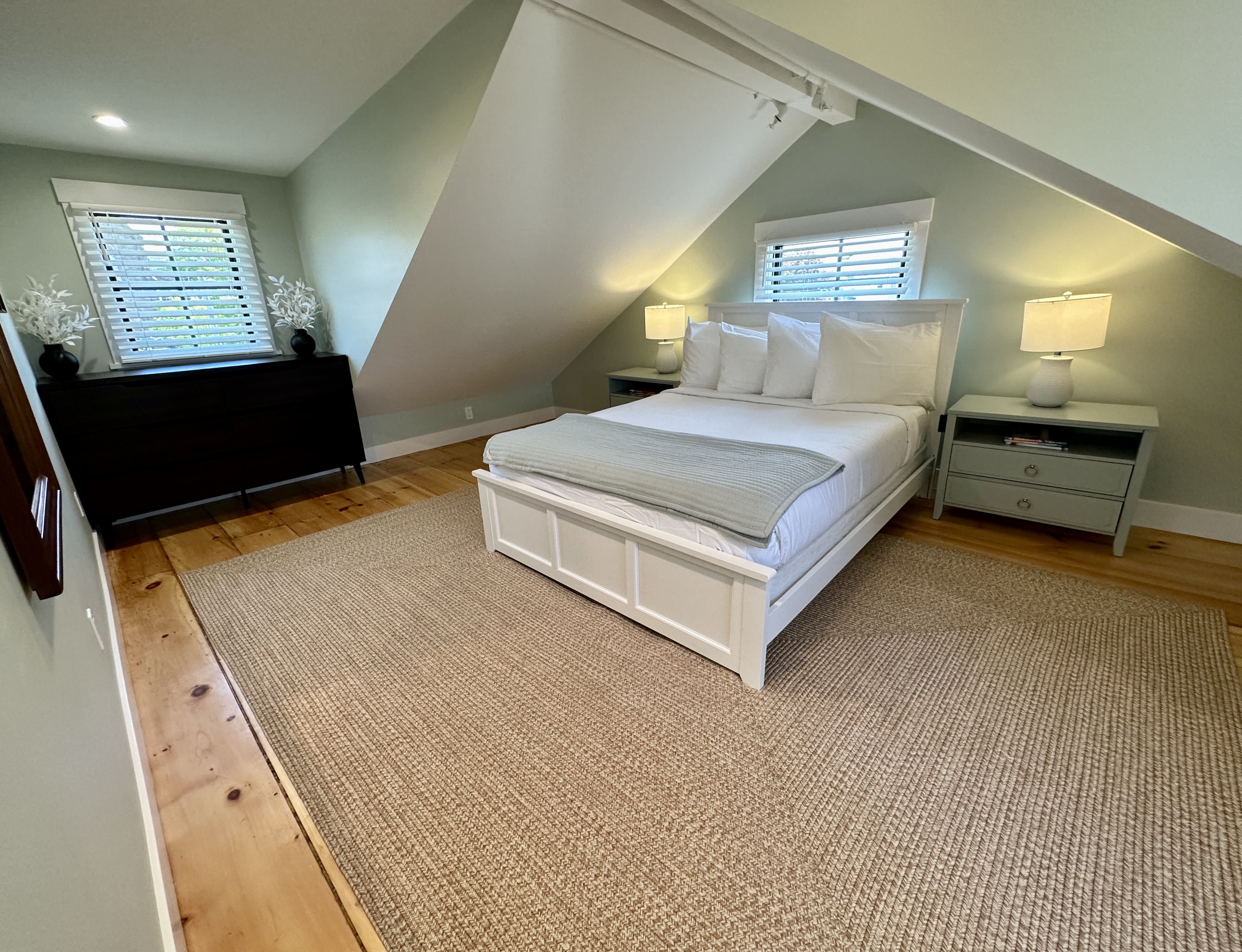 10 Fair Street is a four unit building located right off Historic Thames Street. Unit Two is located on the second and third floor with a spiral staircase connecting the two floors. The building recently underwent a complete renovation and each unit has beautiful hardwood floors throughout, modern furnishings, window fixtures, and a bathroom with a large glass walk in shower. There is also a second half bath located on the third floor. Both bedrooms come equipped with queen size beds, and there is a pullout couch in the living room. The kitchen is fully stocked with everything you could need, as well as, a dining room table which can seat six. The mini splits keep the room nice and cool or cozy and warm depending on your preference. There is off street parking for one car, but another spot is available depending on occupancy. Please request in advance if needed. All of Windwards properties are professionally cleaned between guests and come outfitted in high end linens and towels. Aside from the cleanliness of the space, it is in one of the most sought after locations in Newport. You are steps away from Thames Street, Bannisters & Bowens Wharf, and endless restaurants, bars, and shopping.